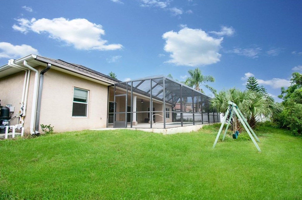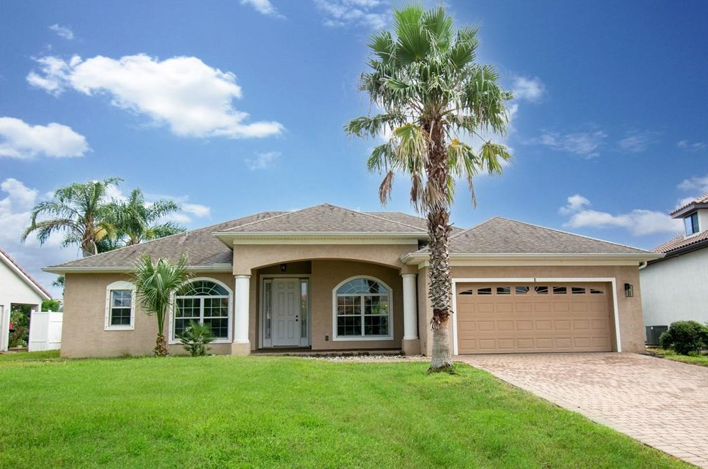 This well-maintained home at 8 Laurel Drive in Hammock Beach, FL has a private swimming pool in a screened lanai.