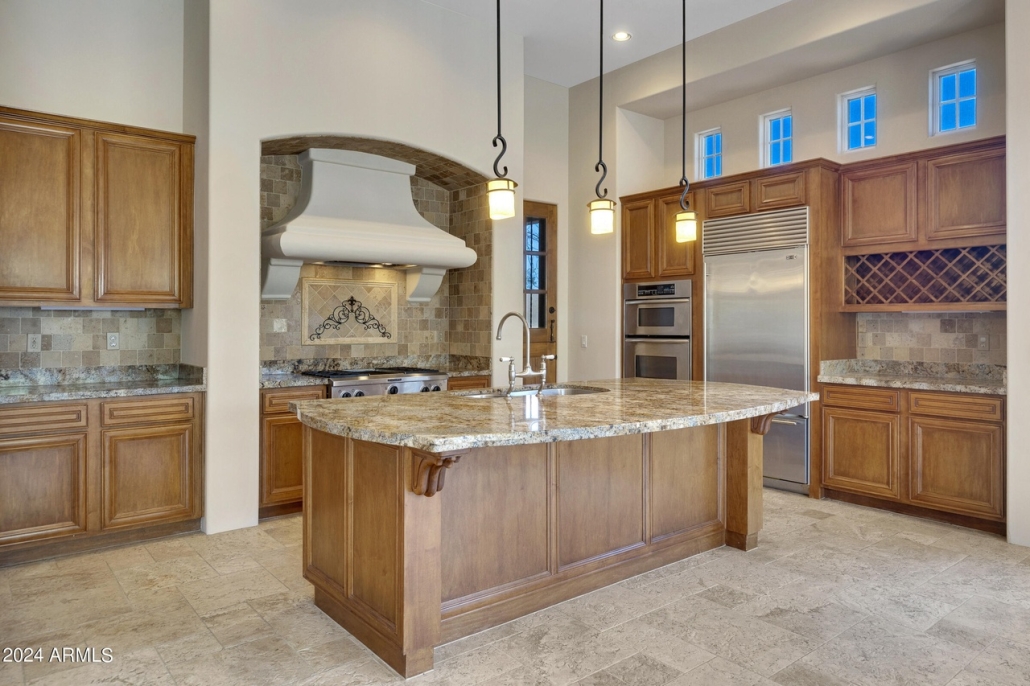 The kitchen features a large island, granite counters, custom alder cabinets, a wall oven and a walk-in pantry.