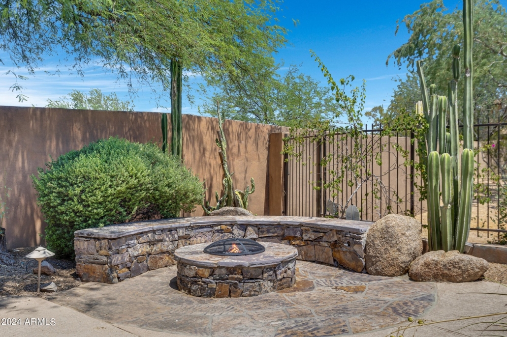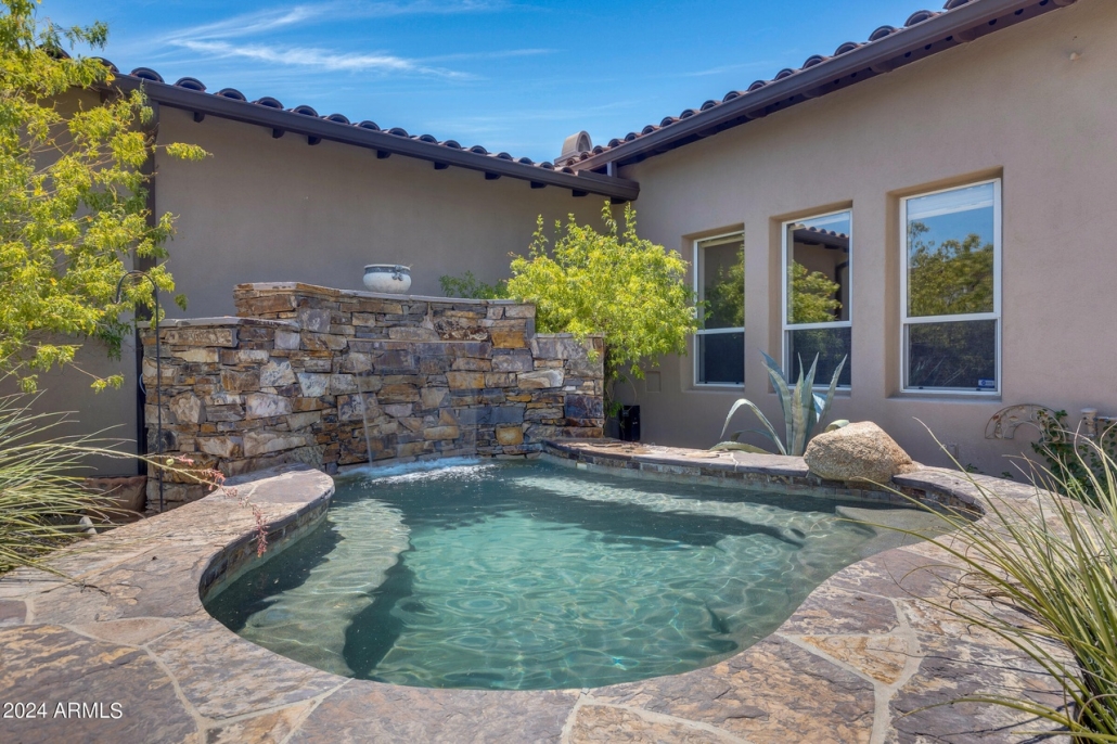 This single-level patio home at 8874 E Flathorn Drive is located close to DC Ranch, AZ community amenities and has a private yard with a spa and a built-in barbecue.