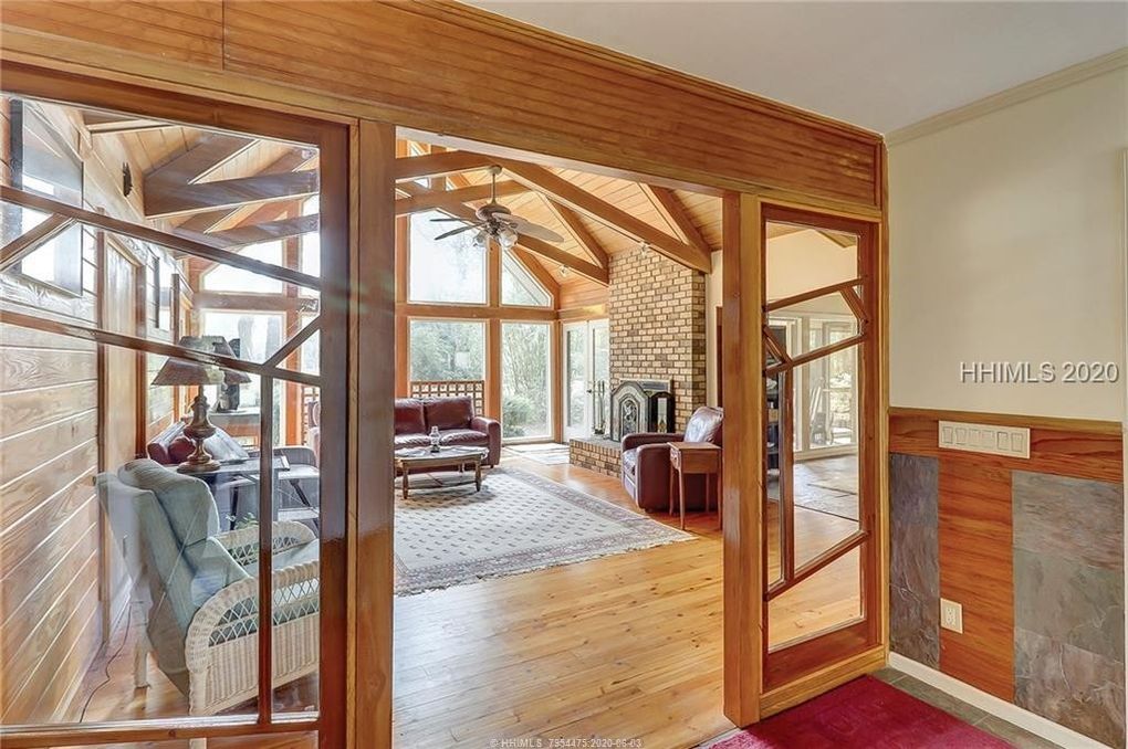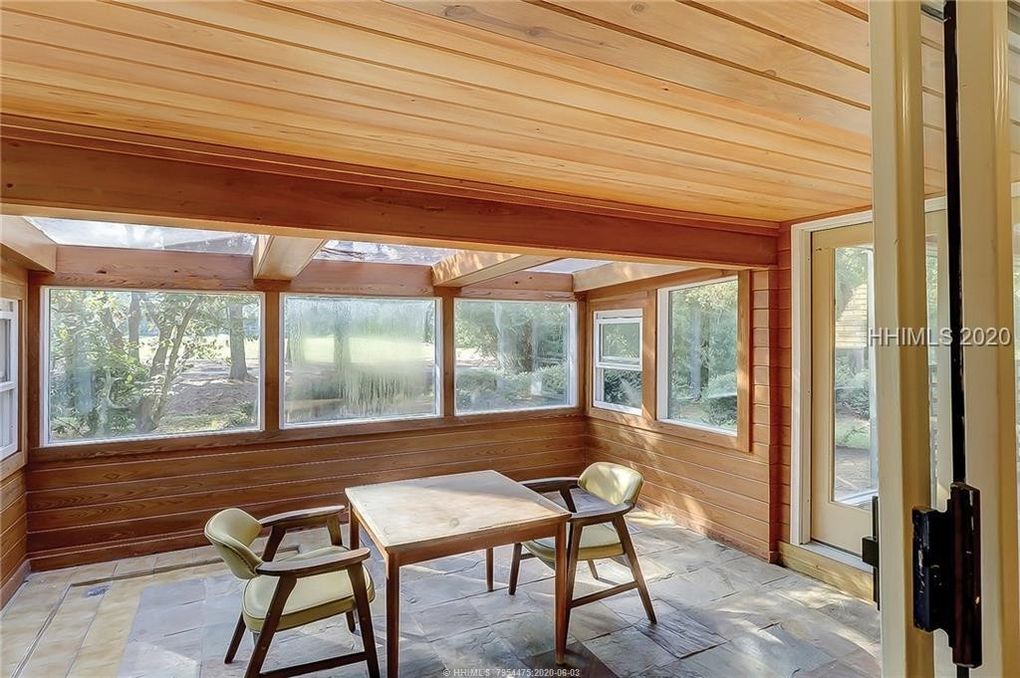 The home’s many unique accents include an oak-lined cathedral ceiling in the great room and stationary panels in the foyer that came from Frank Lloyd Wright House in the historic South Carolina town of Yemassee. Send me more about this home in Sea Pines!