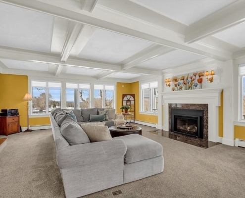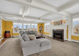 Multiple rooms can serve as welcoming gathering spaces, including a comfortable living room with wet bar and a formal living room with with coffered ceilings and fireplace.