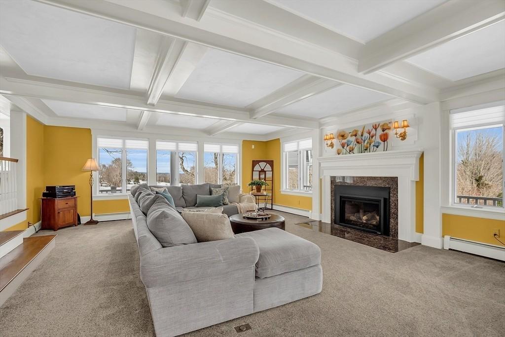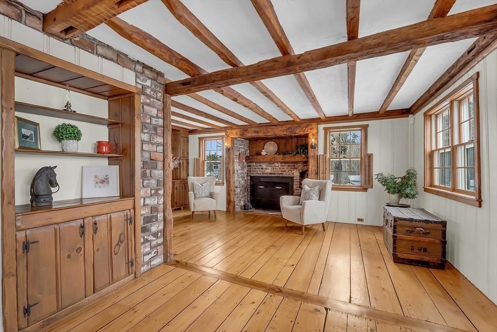- Lower level w/ historic wide planked wood floor, fireplace, beamed ceiling