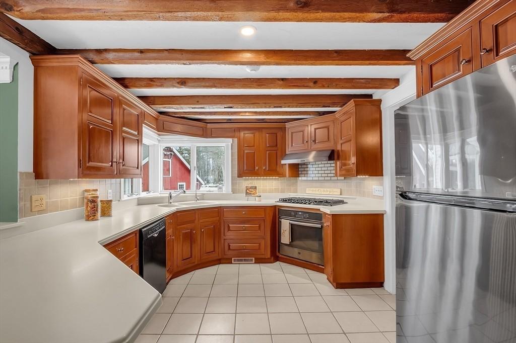 - Modern kitchen w/ cherry cabinets, stainlesss frig & over, gas cooktop, beamed ceiling, tile floor