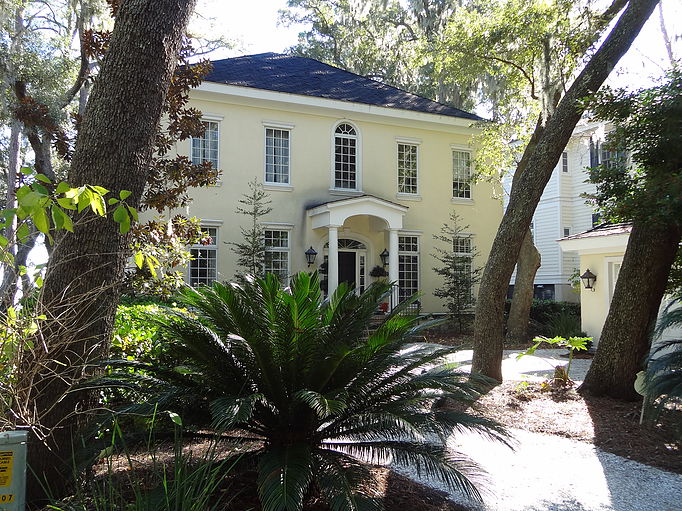 - Hip roof, transom windows, shaded by moss-draped live oaks