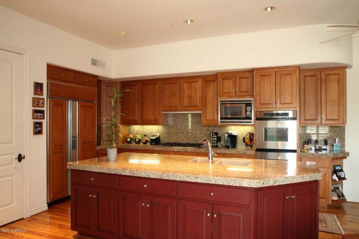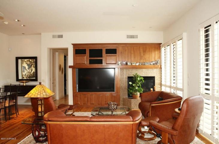 The family room has its own fireplace with built-in entertainment center, including surround sound. A spacious kitchen features alder cabinets with expanded center island and pine flooring. Send me more information about DC Ranch!