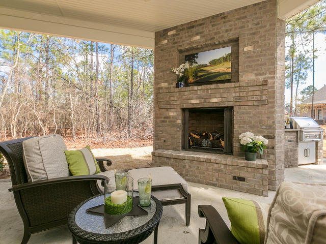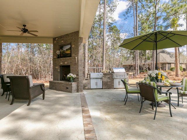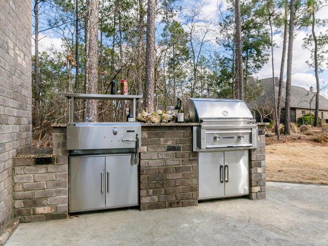 - Covered porch and open patio feature a brick outdoor fireplace, built-in grill, bar sink and surround-sound stereo system