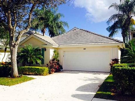 PGA National Resort and Spa, Palm Beach Gardens FL features a 3-BR/3-BA one-story home with prime golf and lake views at 591 Masters Way. A tumbled-marble inlay rug floor in the foyer opens into the great room, with its finely crafted entertainment center. The designer kitchen is impressive with granite island, glass backsplash, maple cabinetry, and extended pantry.
