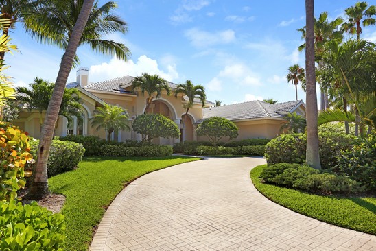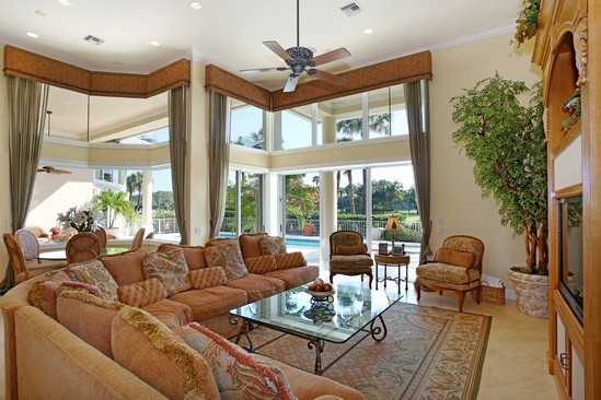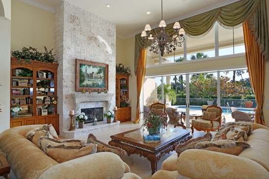 Sailfish Point Stuart FL 4BR/5.5BA golf estate home: This home has details like decorative stone columns and graceful arches. Overlooking No. 1 fairway of the golf course, it has diagonal 24-inch Travertine tile throughout the living area, a tray ceiling and casement windows in the dining room and a coral stone gas fireplace between custom built-in cabinetry in the living room.