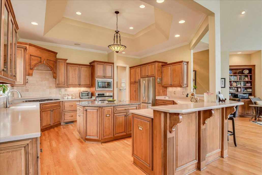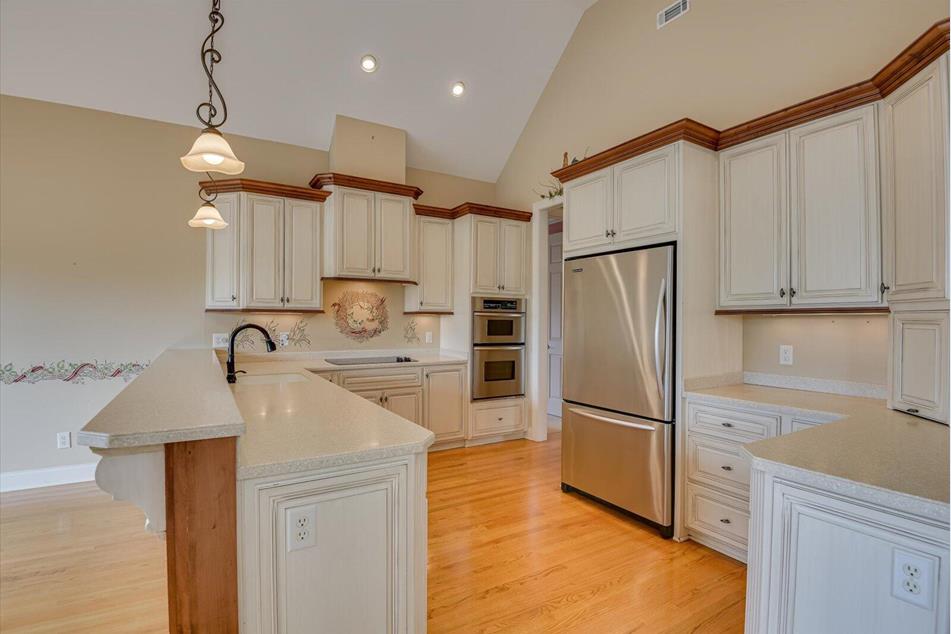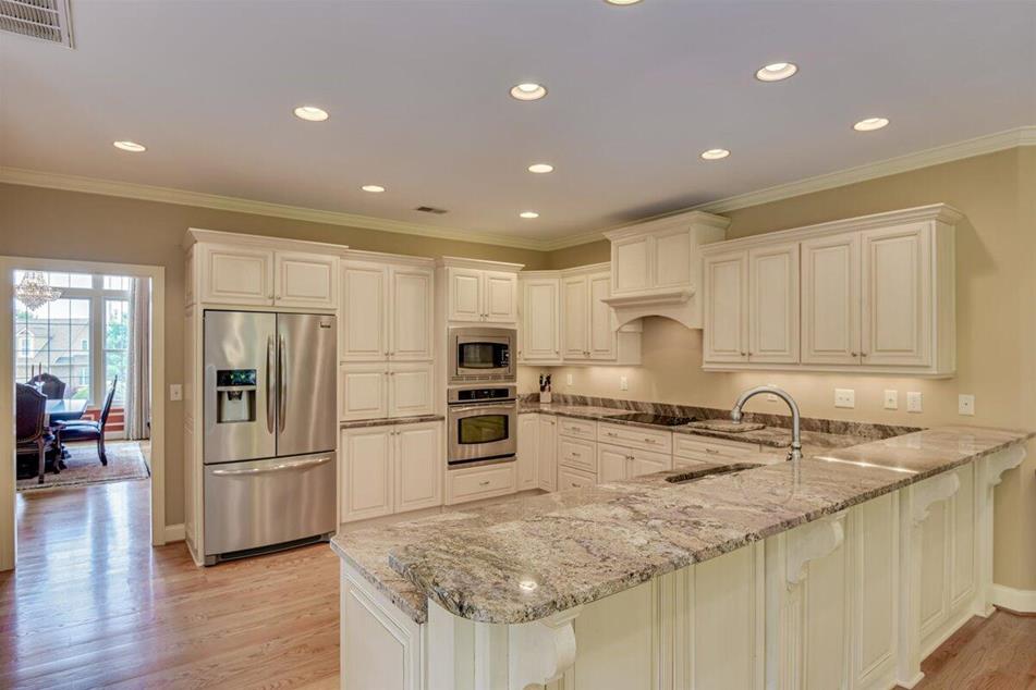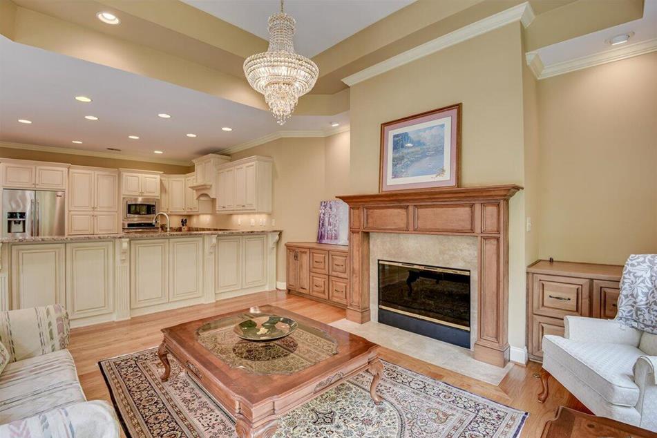The kitchen offers a large island with a quartz counter that seats 10. Additional features include new, stainless, top-of-the-line appliances, gas cooktop with designer hood, double ovens, wine cooler and custom cabinetry.