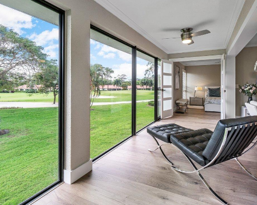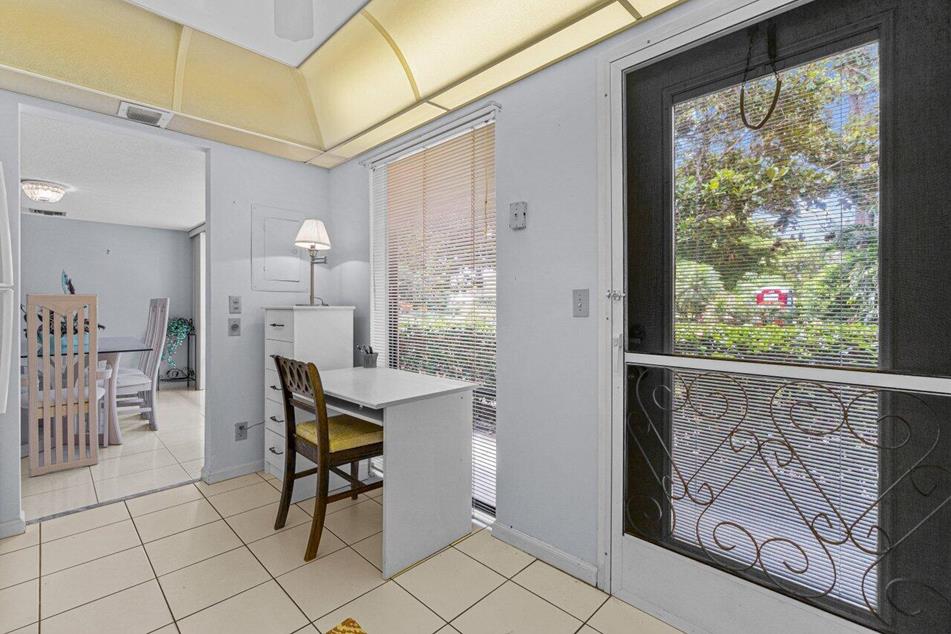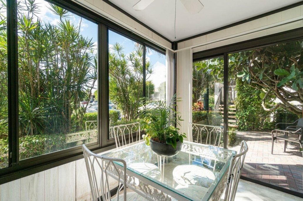 The condo’s back patio’s is enclosed for additional living space and there is wood flooring in the main living area.