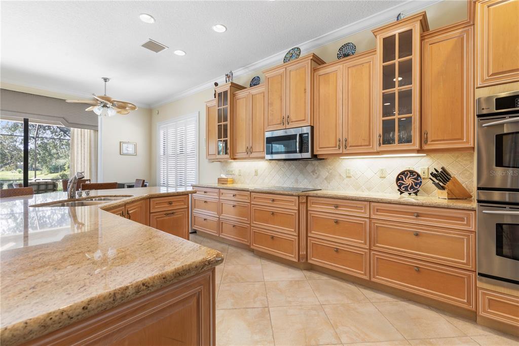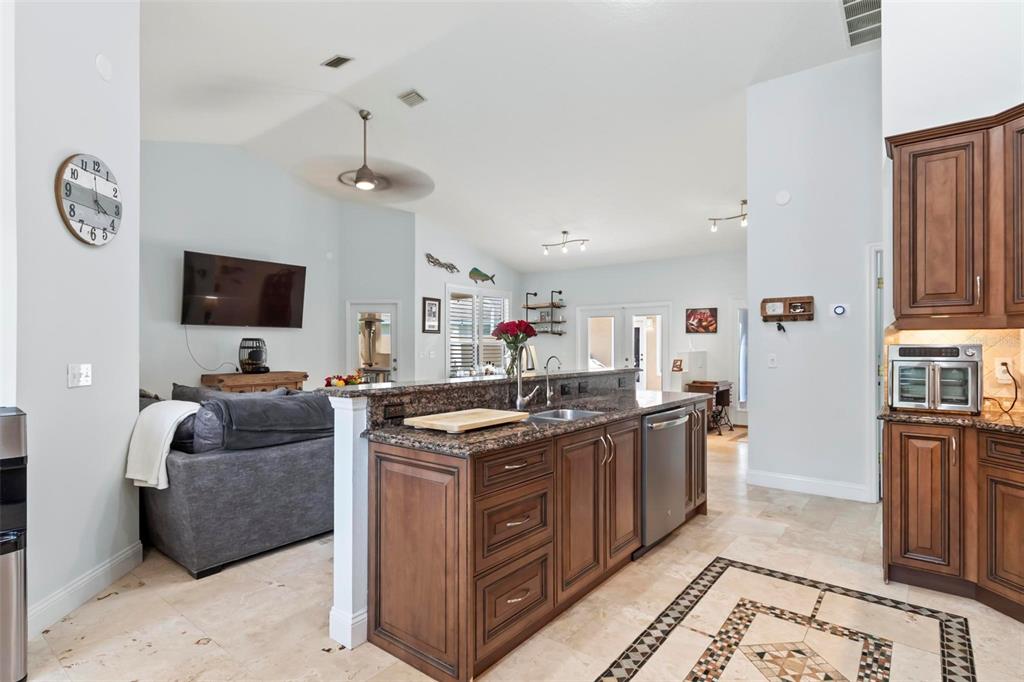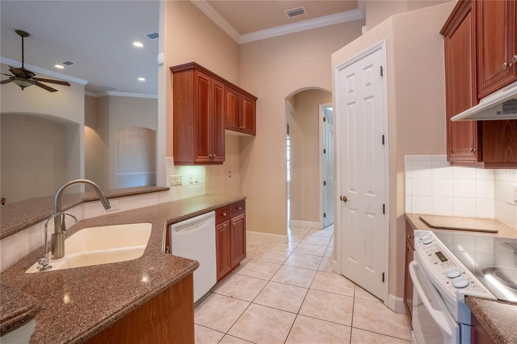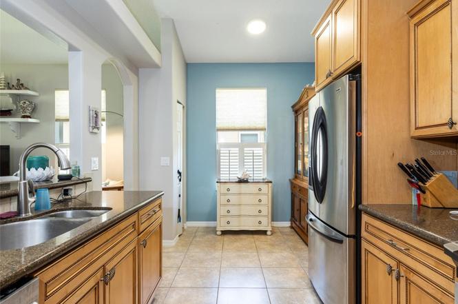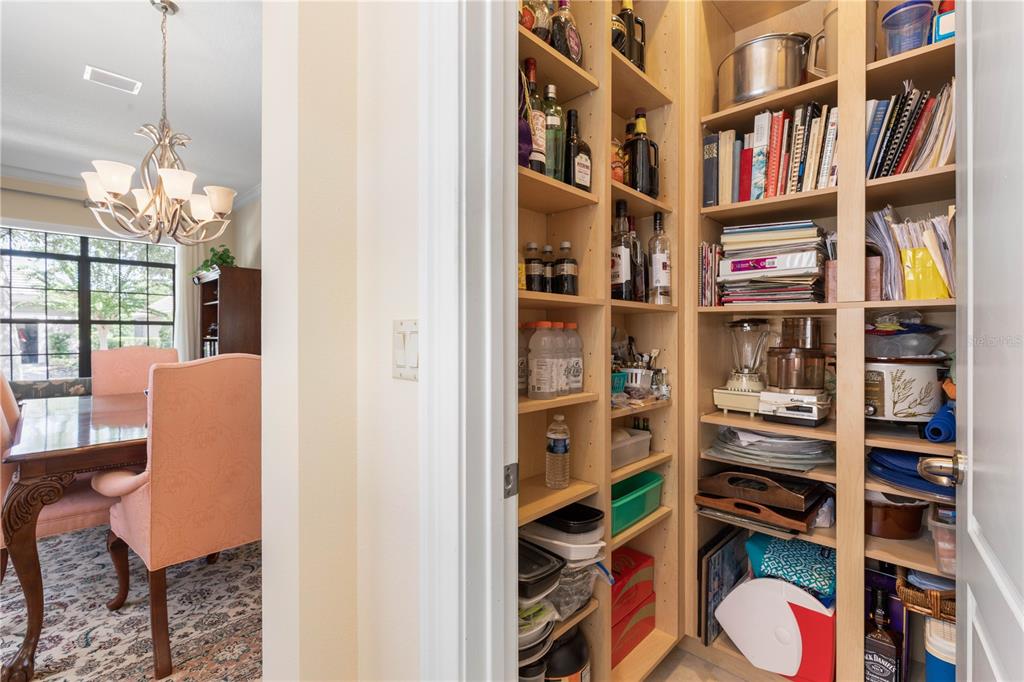 The kitchen has uniquely detailed cabinetry, granite countertops, stainless steel appliances and a pantry.