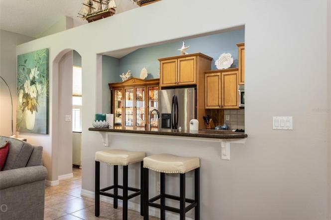 Enter this 2BR/2BA home through a leaded-glass front door which leads to the main living space with vaulted ceilings.