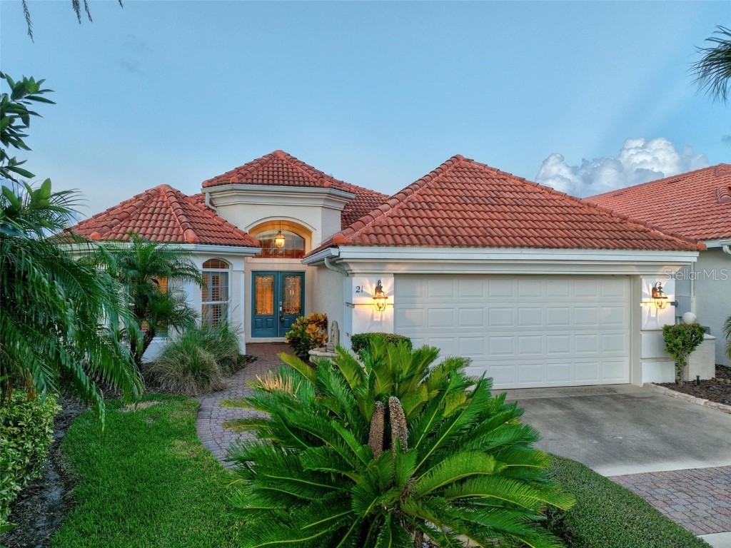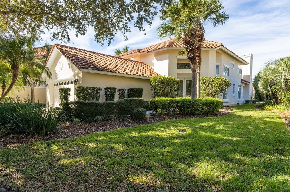 There are relaxing lake views from this Spanish style courtyard home on a quiet cul-de-sac at 24 La Costa Place in Hammock Dunes, FL.