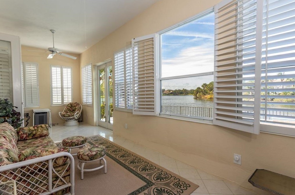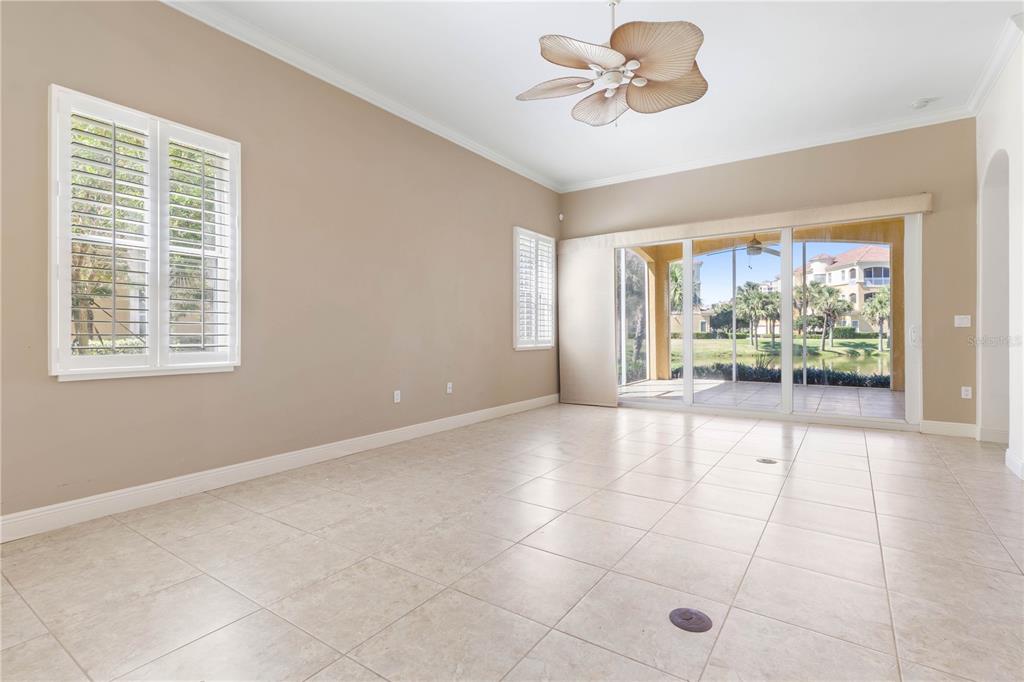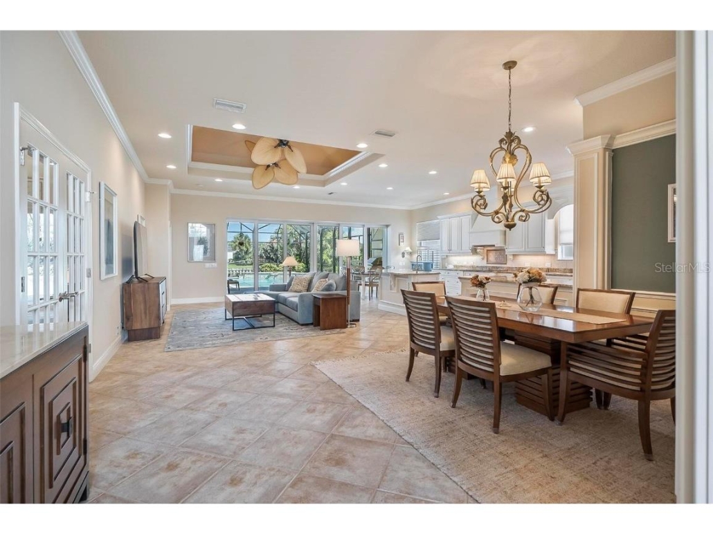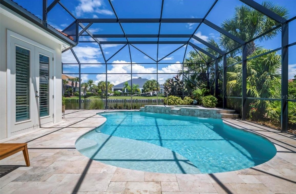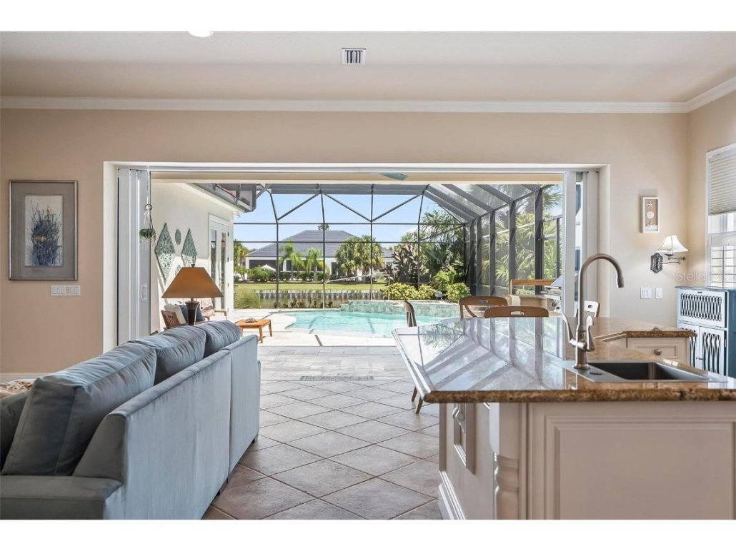 Directly off the living room is a lakefront screened lanai featuring the pool, an outdoor kitchen, a water feature and an eating area. Send me more about this home in Hammock Dunes!