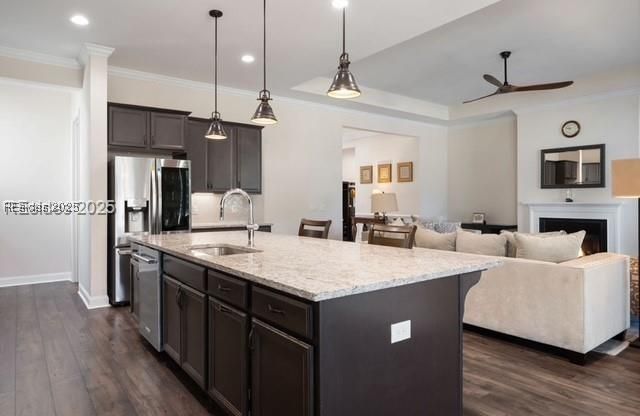 Desirable features include tray ceilings, a fireplace, a casual dining area and an expanded covered patio.