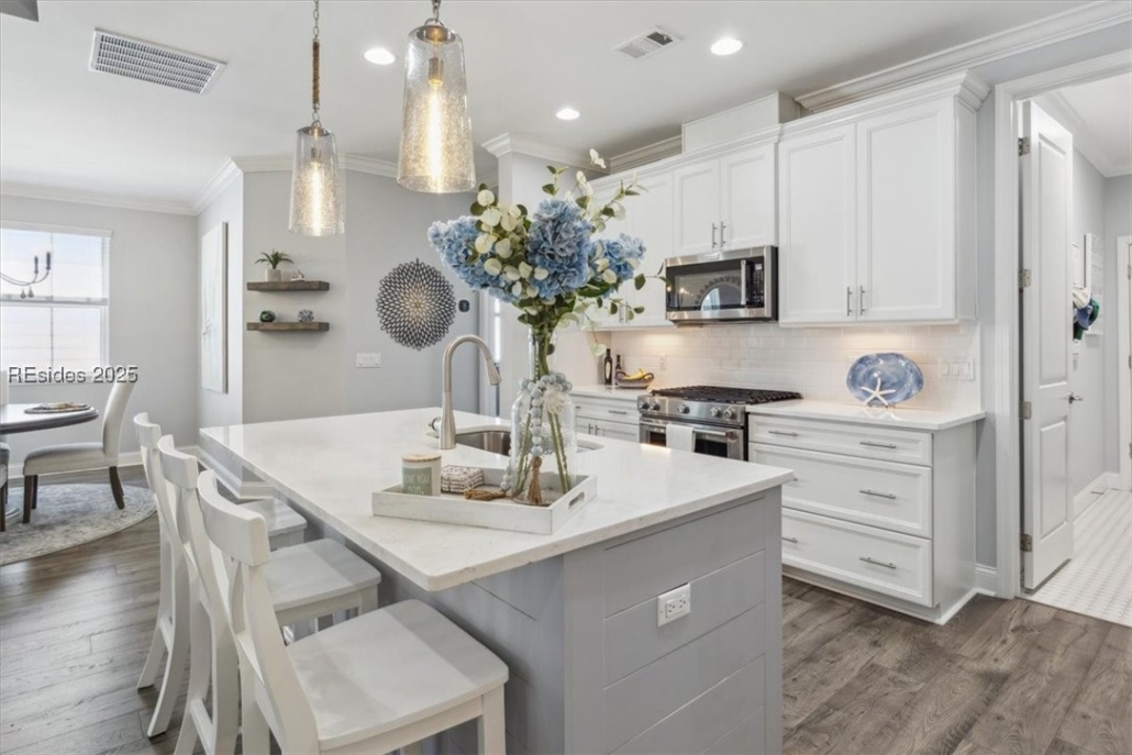 An island kitchen features a breakfast bar and is outfitted with a high-end gas convection oven and 42-inch, soft-close cabinets.