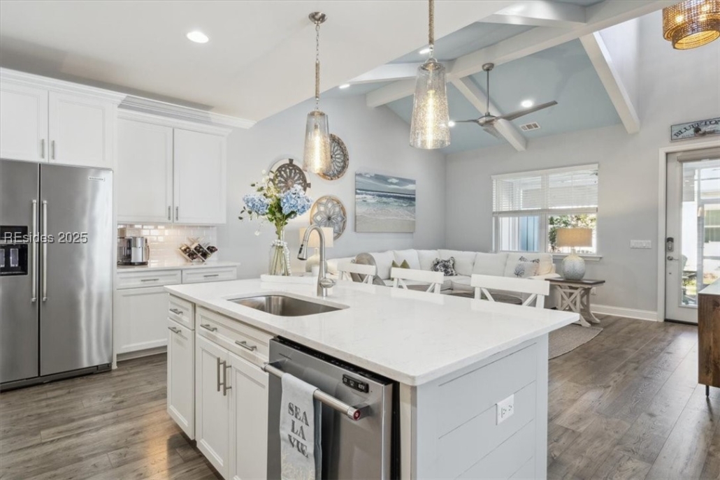 The open floor plan includes a spacious island kitchen.