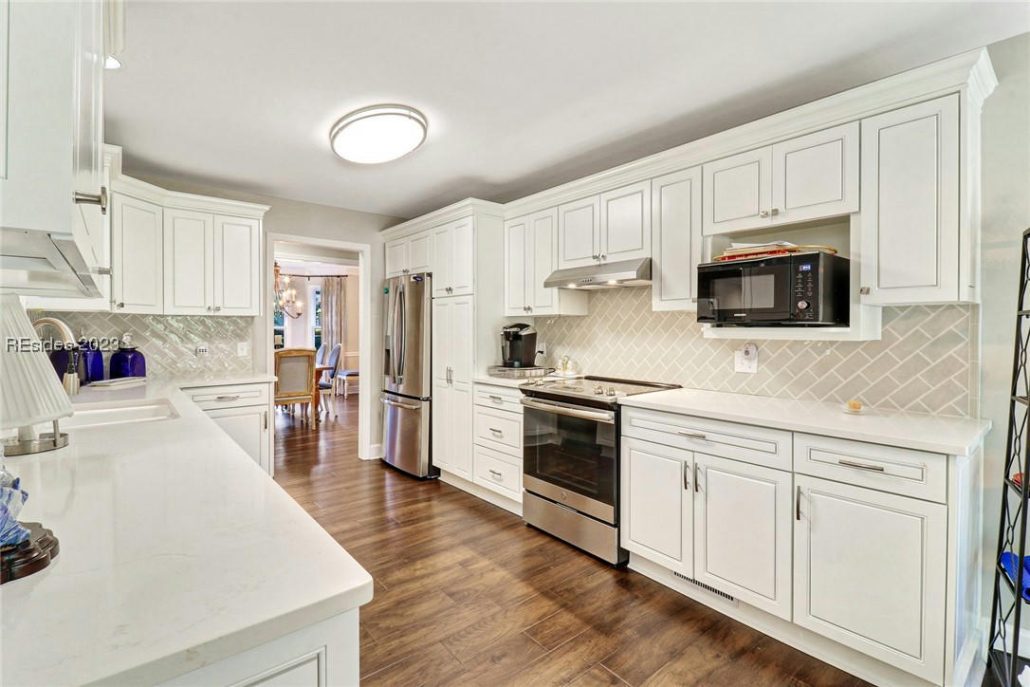 The updated kitchen includes quartz counters, newer appliances, a farm sink and subway tile backsplash.