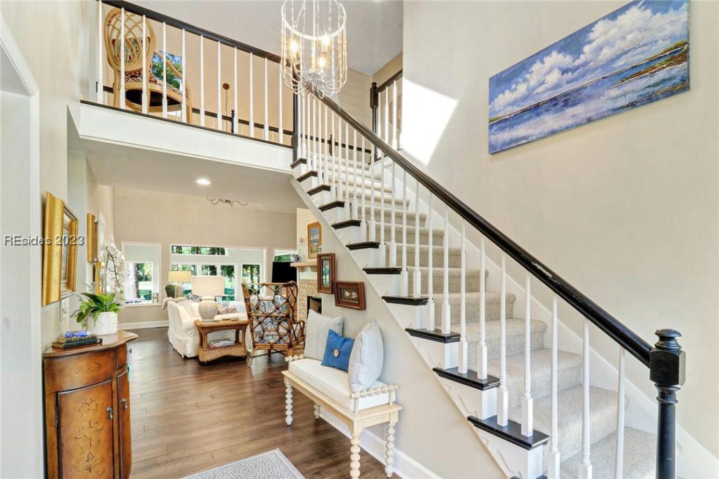 This pristine, recently remodeled home at 32 Wax Myrtle Lane with serene lagoon views in Moss Creek, SC is a bright, livable layout with LVP flooring and an expansive great room.