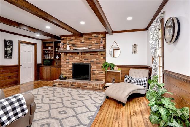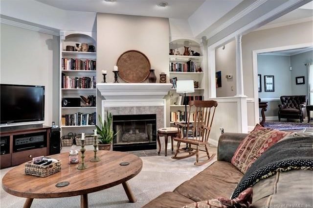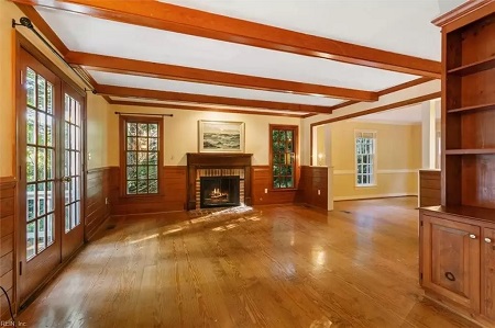 An open plan includes fireplace, natural light.