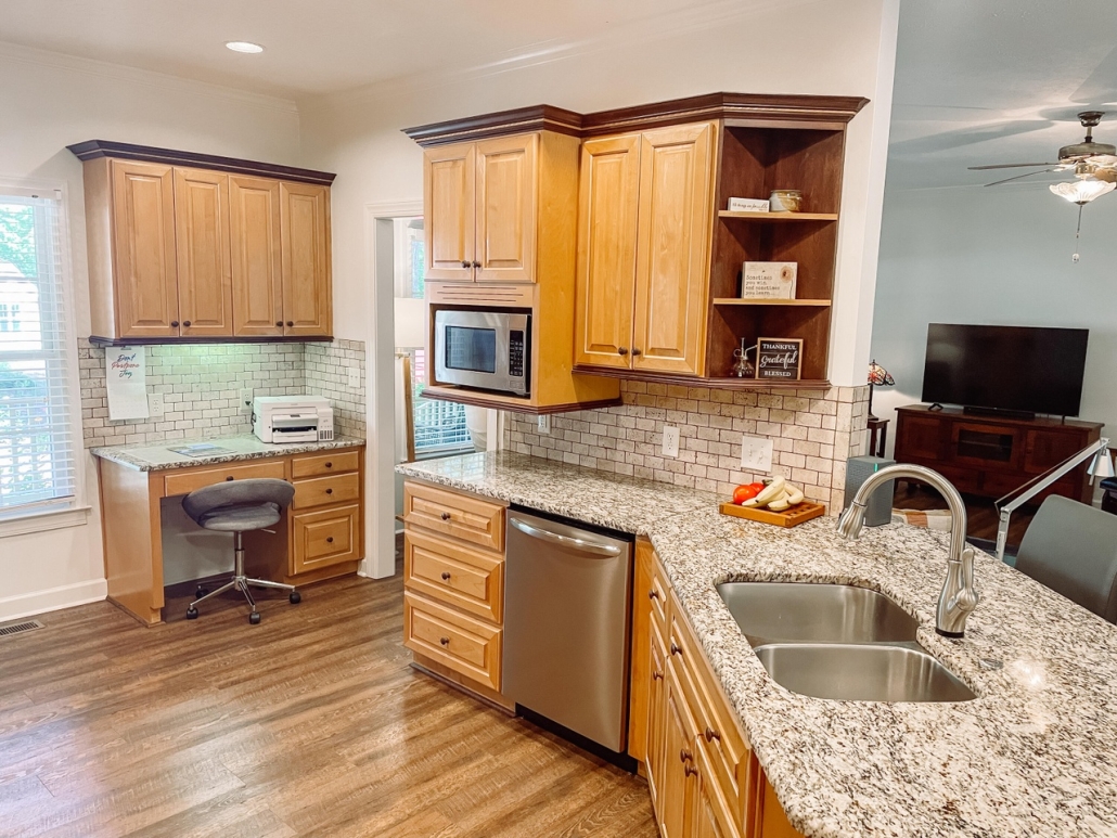 - Kitchen w/ quartz countertops, tile backsplash, large island