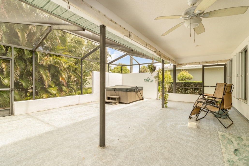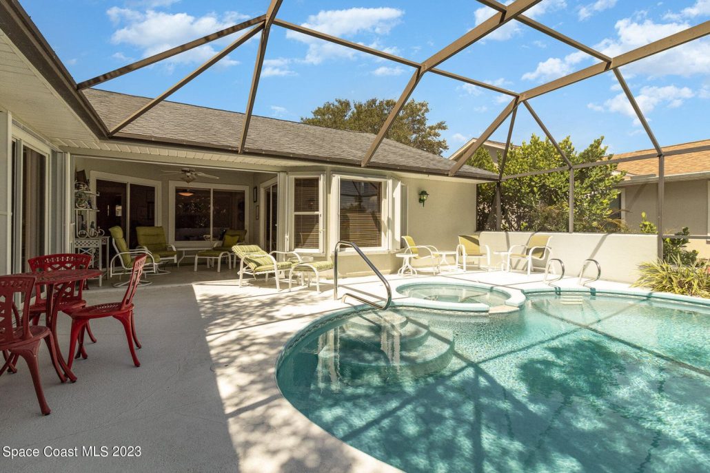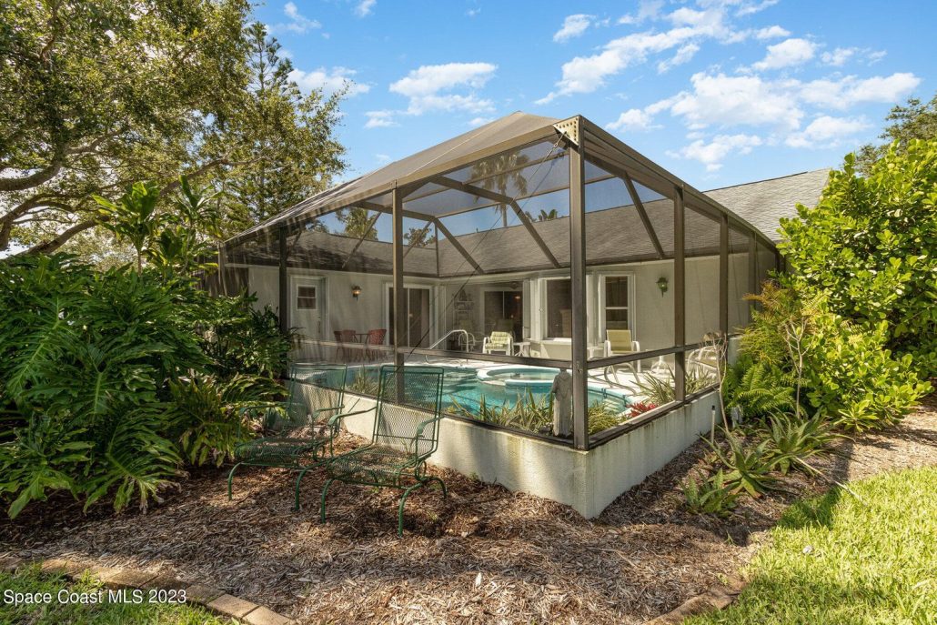 This 1,904-sf Phoenix-model home at 1512 Chesapeake Court in Indian River Colony Club, FL has a private pool and spa under a screened lanai.