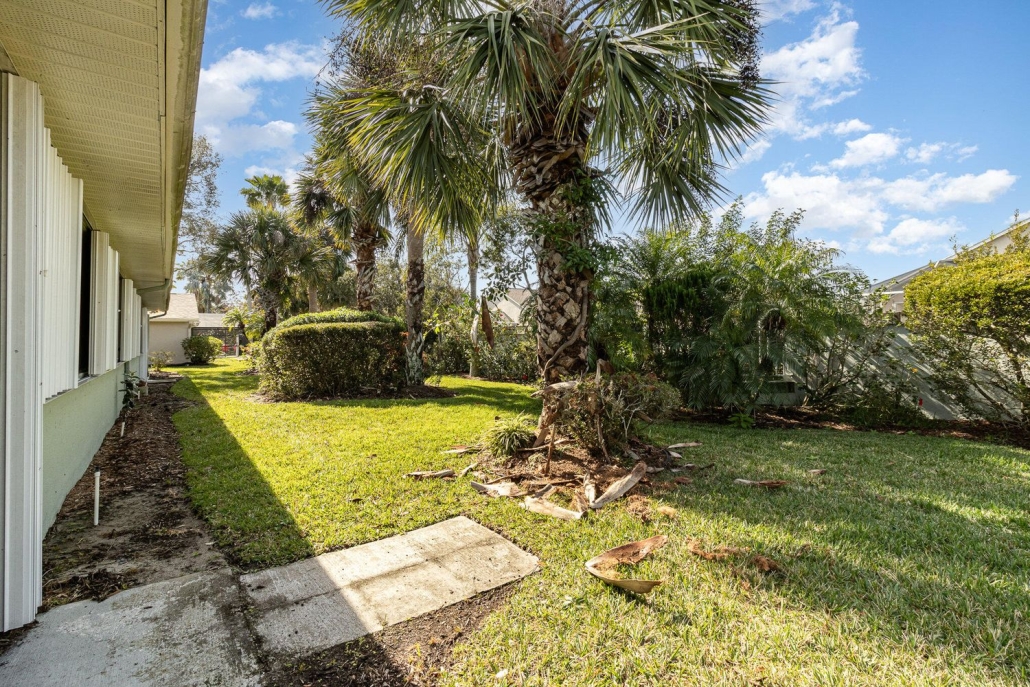 The home is in pristine condition with lush landscaping and a palm tree-lined patio / pool enclosure.