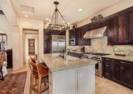 - Chef’s island kitchen w/ gas cooktop, granite counters, pantry and wall ovens