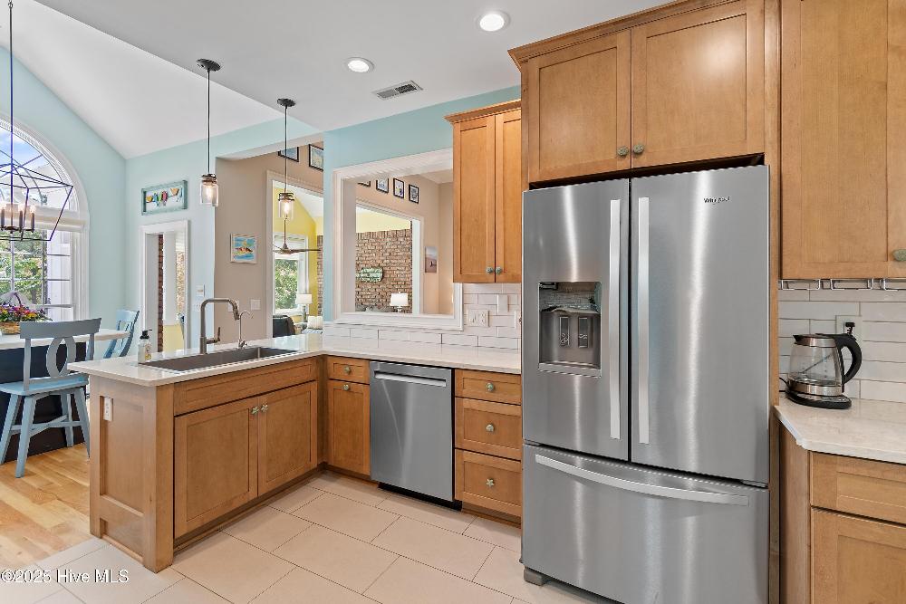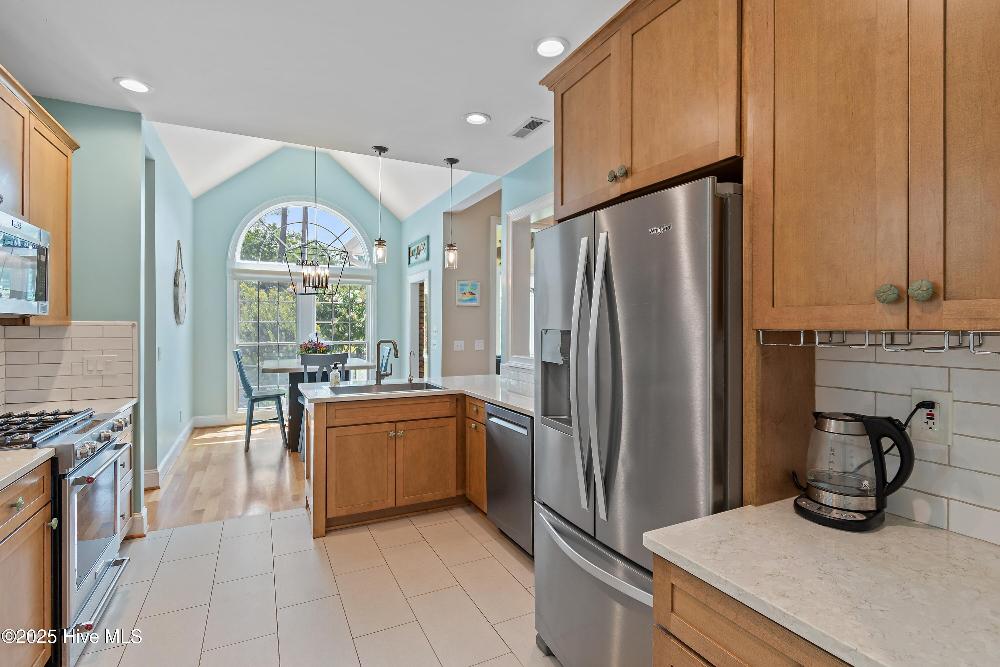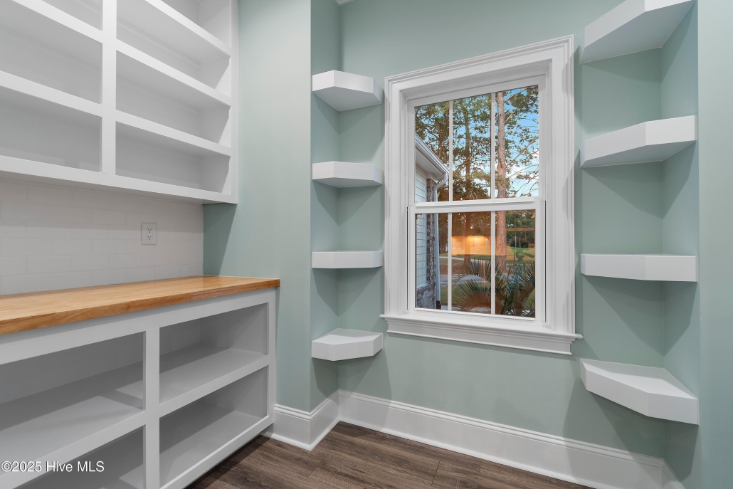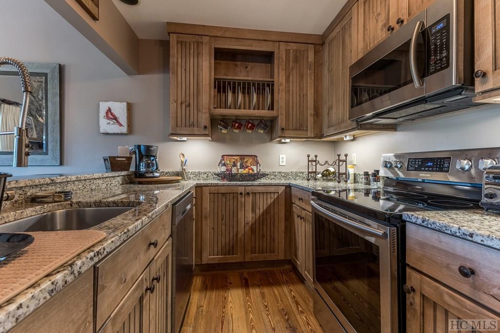 The island kitchen is thoughtfully designed with stainless steel appliances, custom hickory cabinetry,built-in desk, and large pantry.