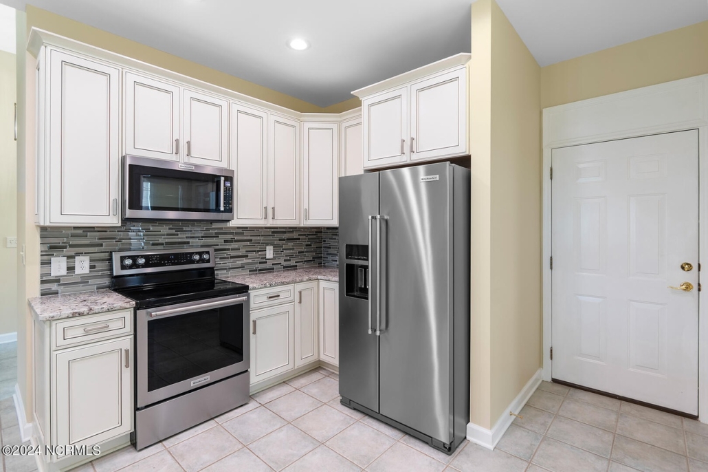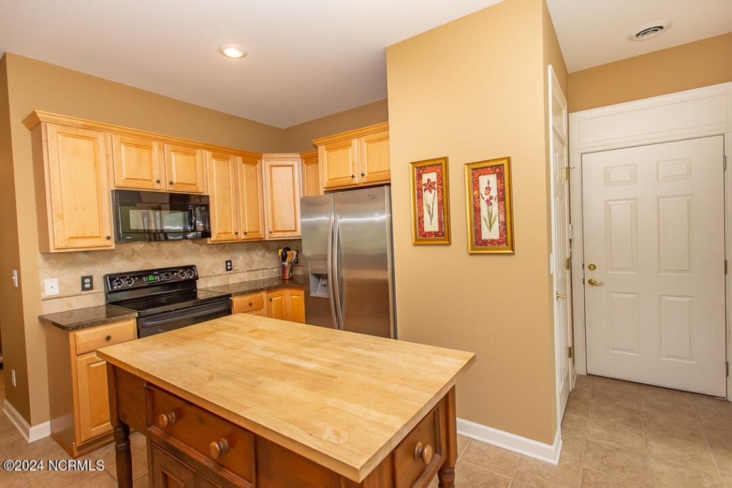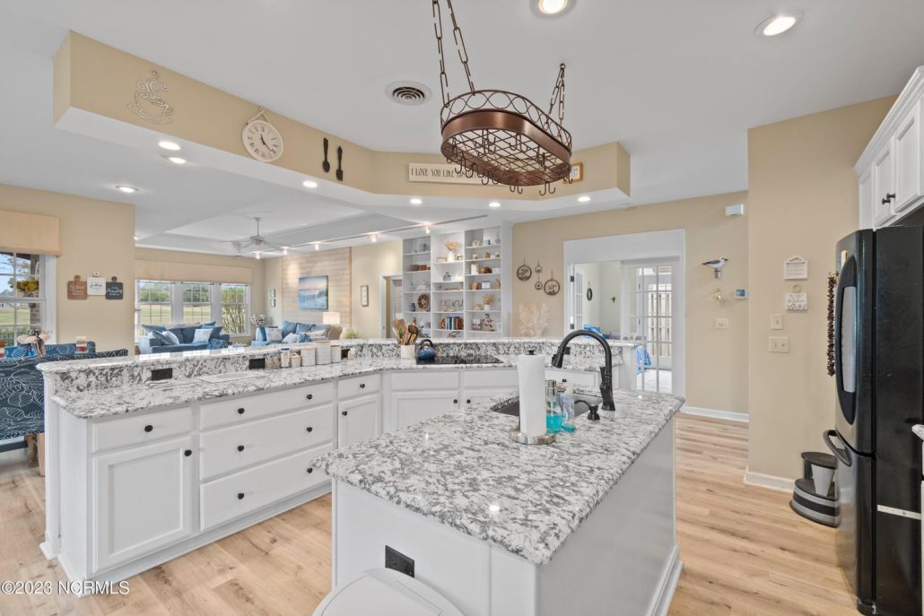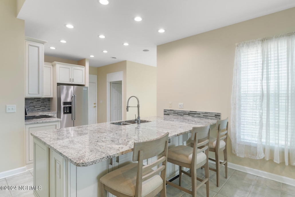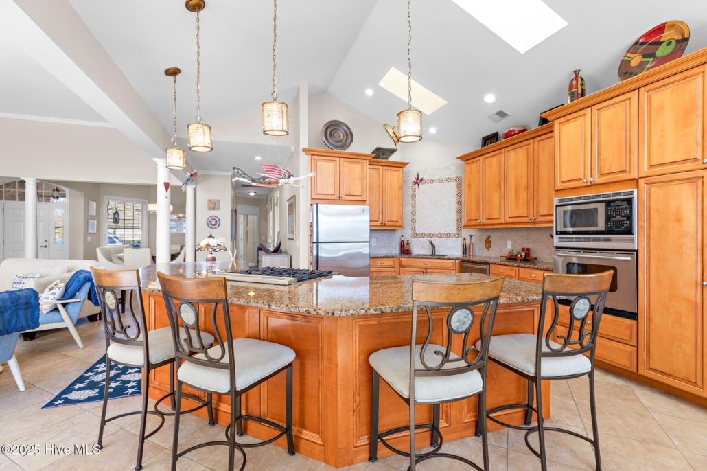 The kitchen features a large island, abundant cabinet space, a tile backsplash, granite countertops and a gas stovetop.