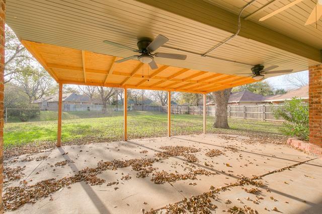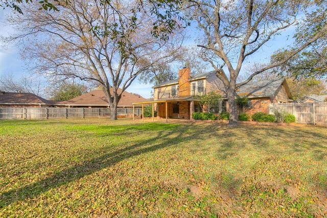 The fenced-in backyard features a covered patio that looks out onto mature hardwood trees. Send me more about this home in Pecan Plantation!