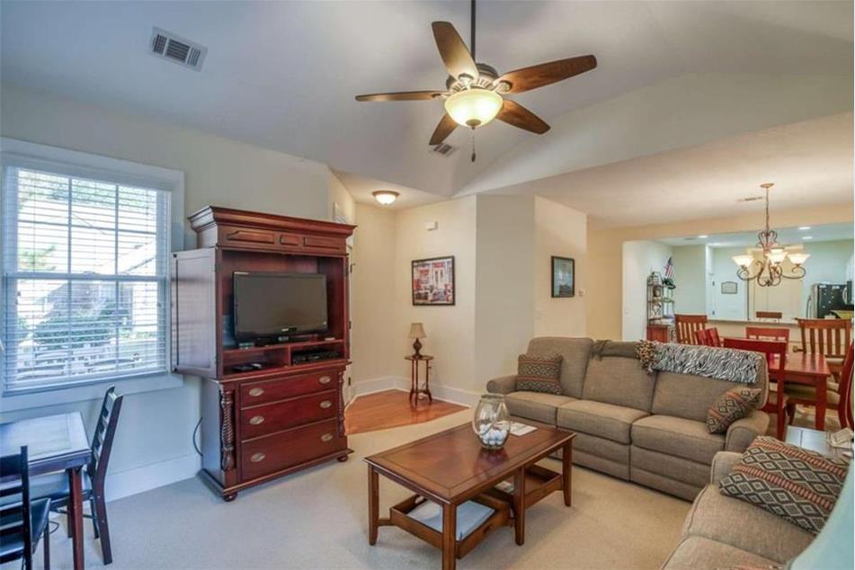 The villa features a nice wooded view outside and inside presents an open concept with spacious living room and dining areas. A generously sized kitchen features granite countertops, breakfast bar, plenty of cabinet space and a pantry.