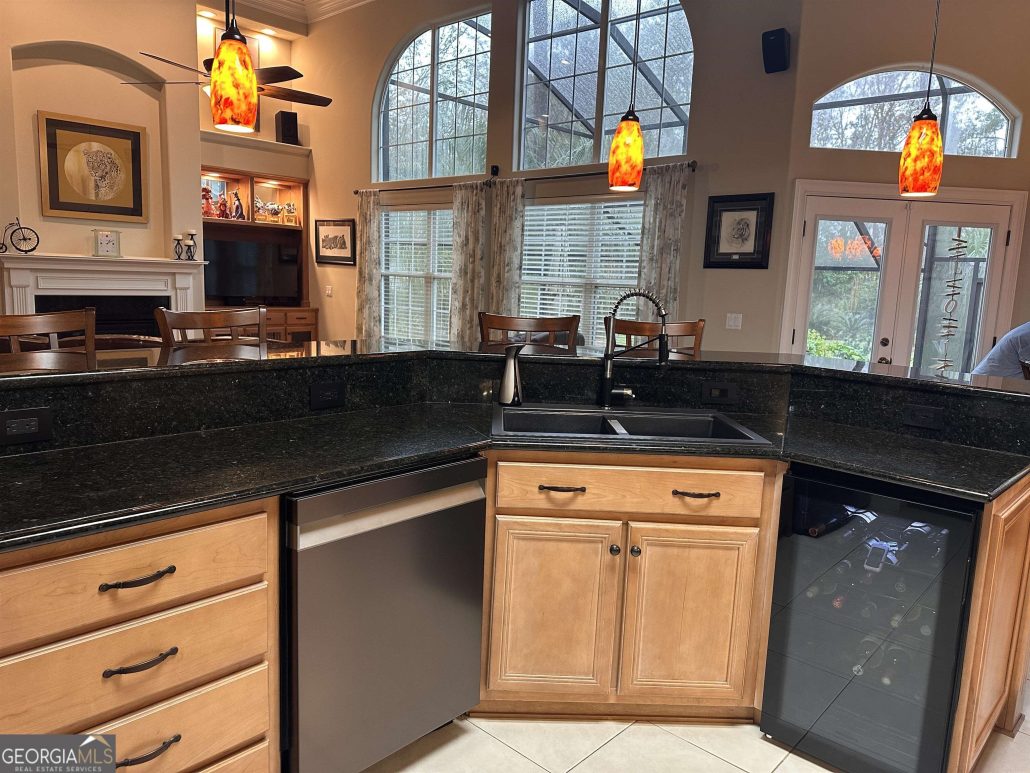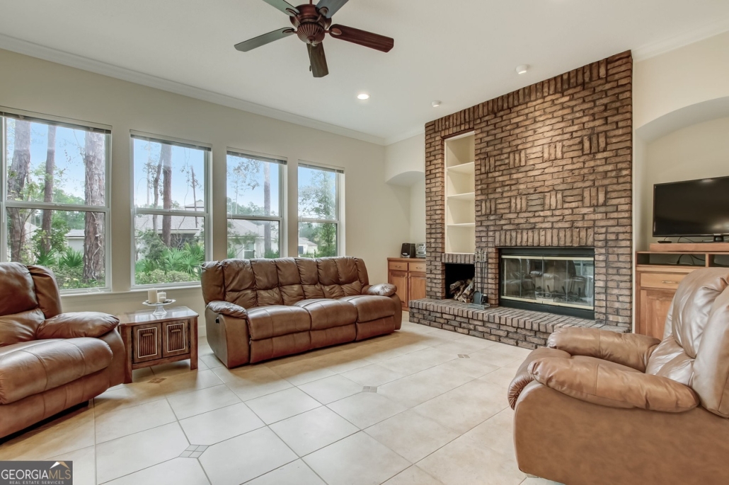 The kitchen and family room provide a large, open-concept space, well lit with windows across the back and centered on a brick fireplace. Send me more about this home in Osprey Cove!