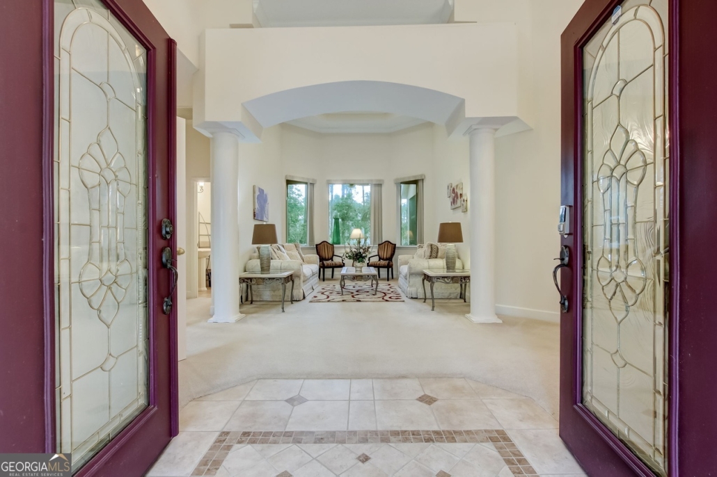 Entry is through a grand foyer that leads to a formal living room.