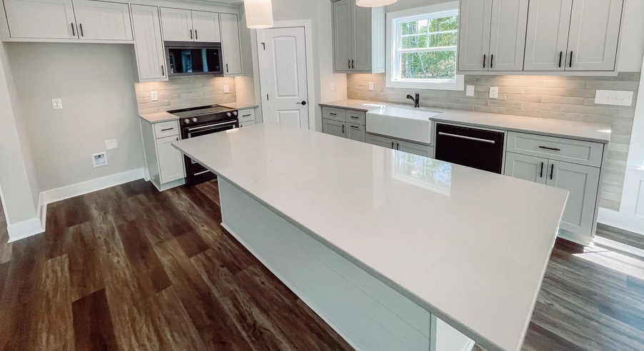 - Distinctive white granite countertops in kitchen