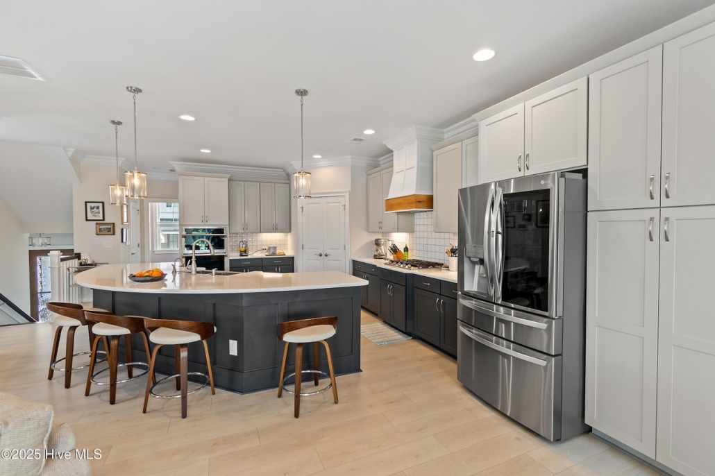 The island kitchen is thoughtfully designed with stainless steel appliances, custom hickory cabinetry,built-in desk, and large pantry.