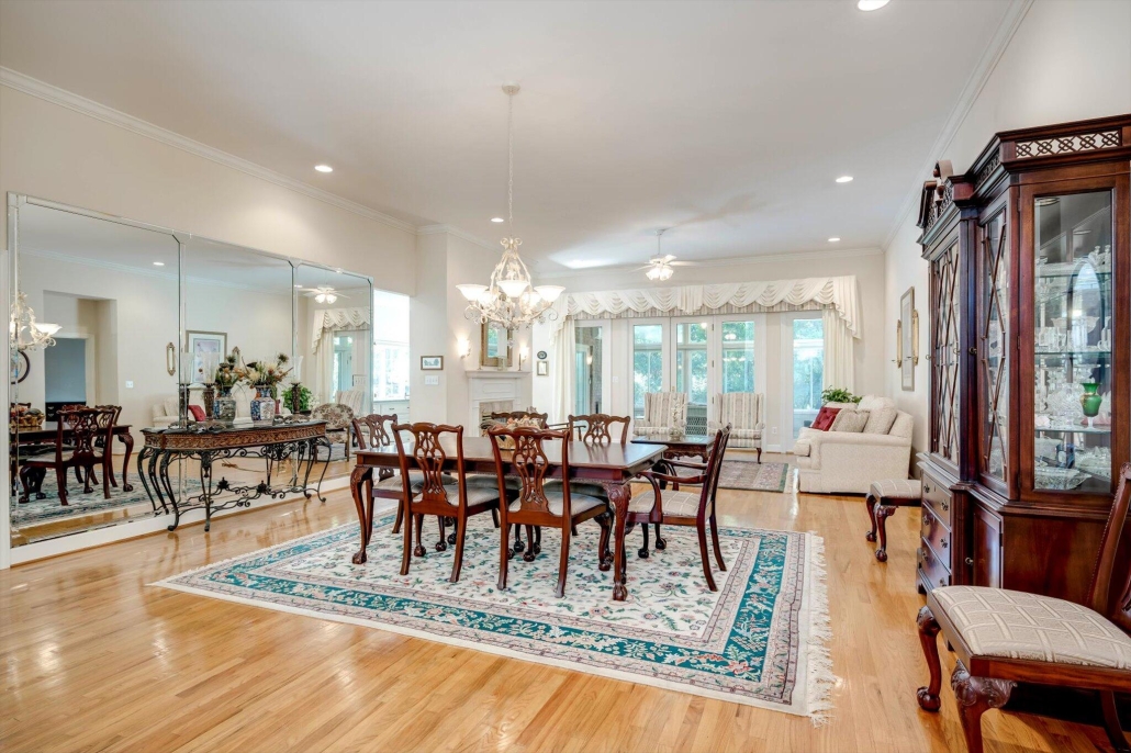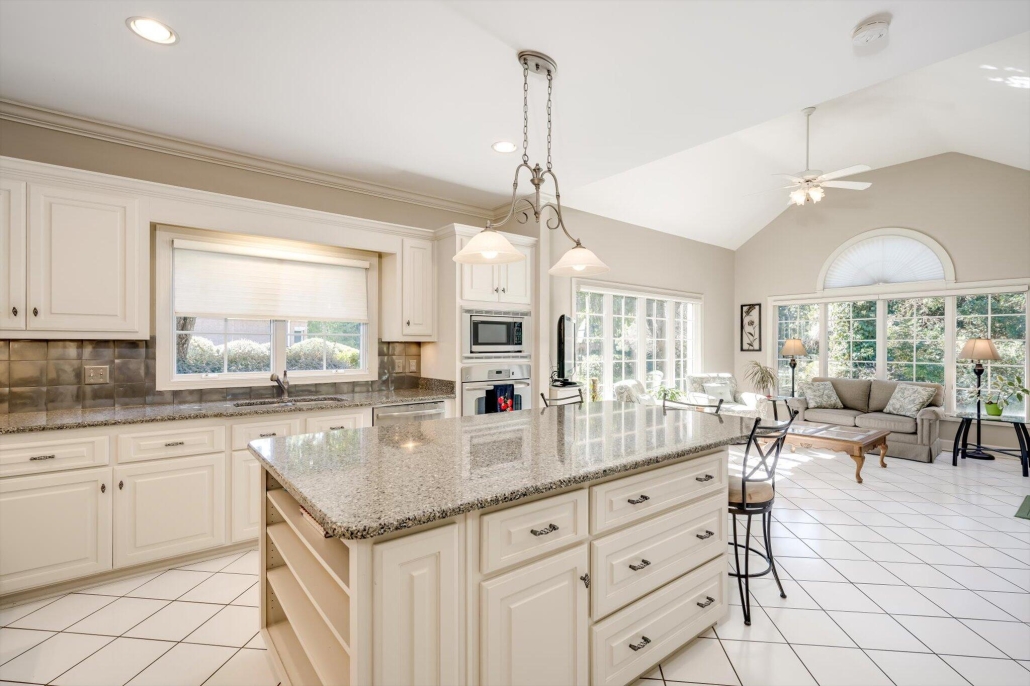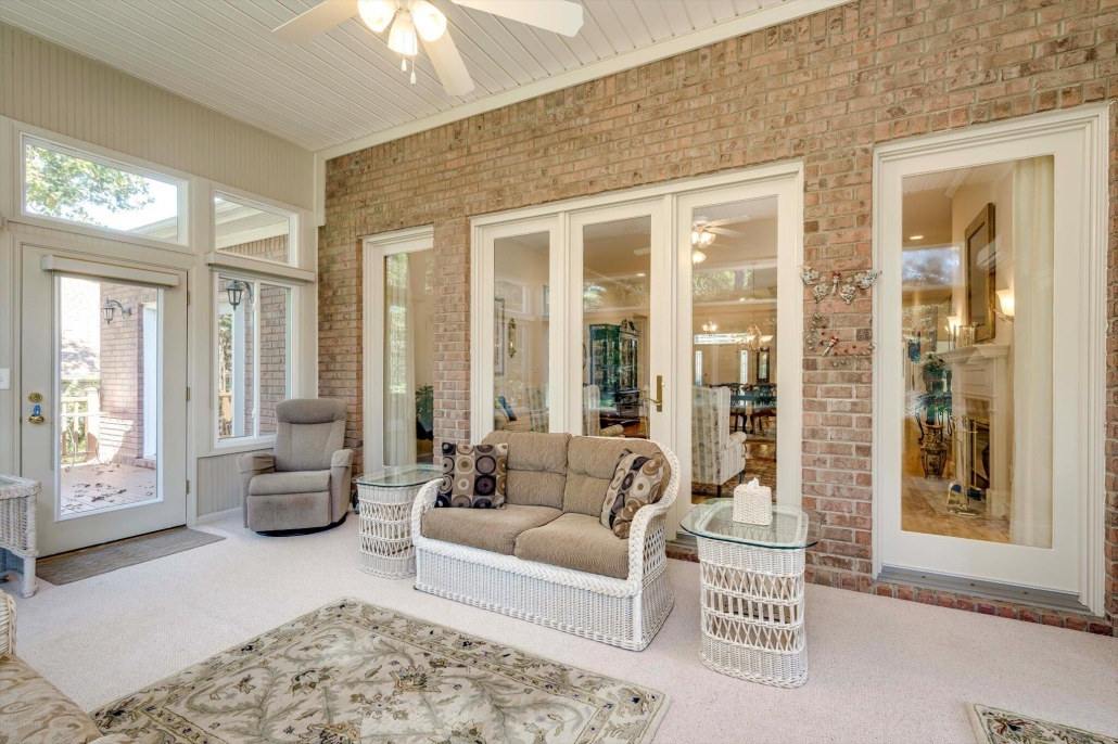 Floor-to-ceiling windows across the rear of the home capture sweeping views of the recently renovated Dogwood golf course, while a screened porch overlooks the professionally landscaped yard.
