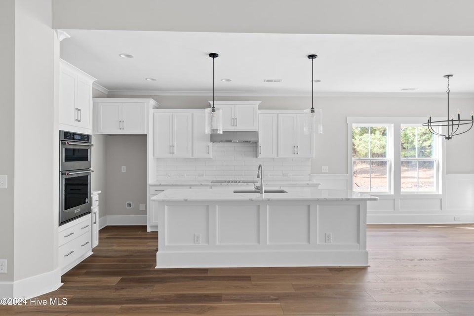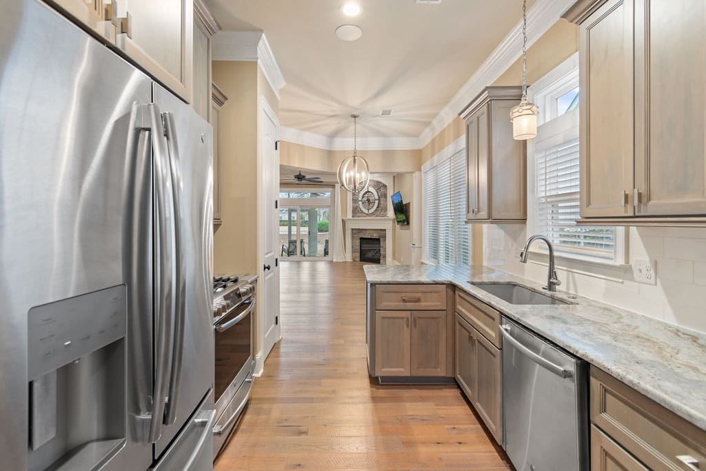 The island kitchen is thoughtfully designed with stainless steel appliances, custom hickory cabinetry,built-in desk, and large pantry.