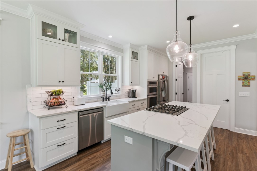 The home’s primary suite is conveniently located on the main floor, while the kitchen anchors the living space with a gas range, custom pantry, and seamless flow to gathering areas.