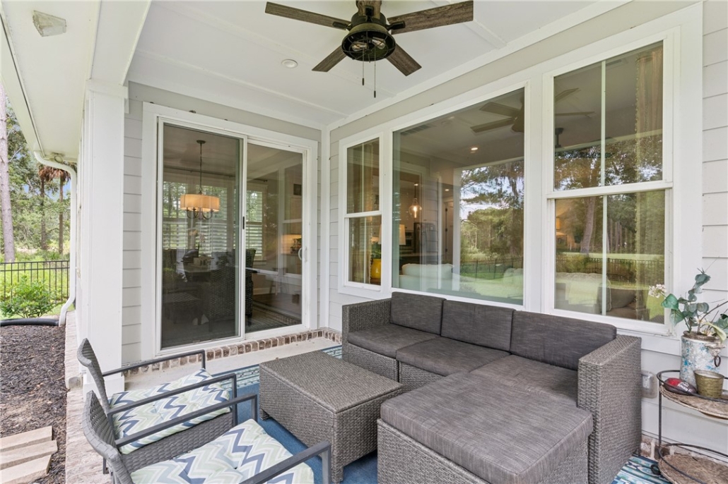 This charming, Coastal-style home at 506 Blue Heron Trail in Sanctuary Cove, GA has a welcoming front porch, an architectural shingle roof and refined exterior details.