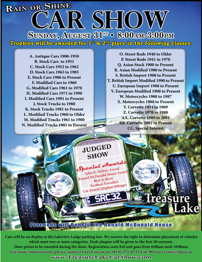 Treasure Lake DuBois PA Car Show Aug. 31: 8 a.m. to 3 p.m., rain or shine. This is a judged show divided into 30-plus categories of vehicle, including Street Rods, Antique Cars, British Imports, Corvettes from 1954 and Motorcycles. Cars will be on display in the community’s Lakeview Lodge parking lot. There will be several special awards, including a Best in Show and a category award for highest odometer mileage. Proceeds benefit Ronald McDonald House. Send me more information about Treasure Lake!